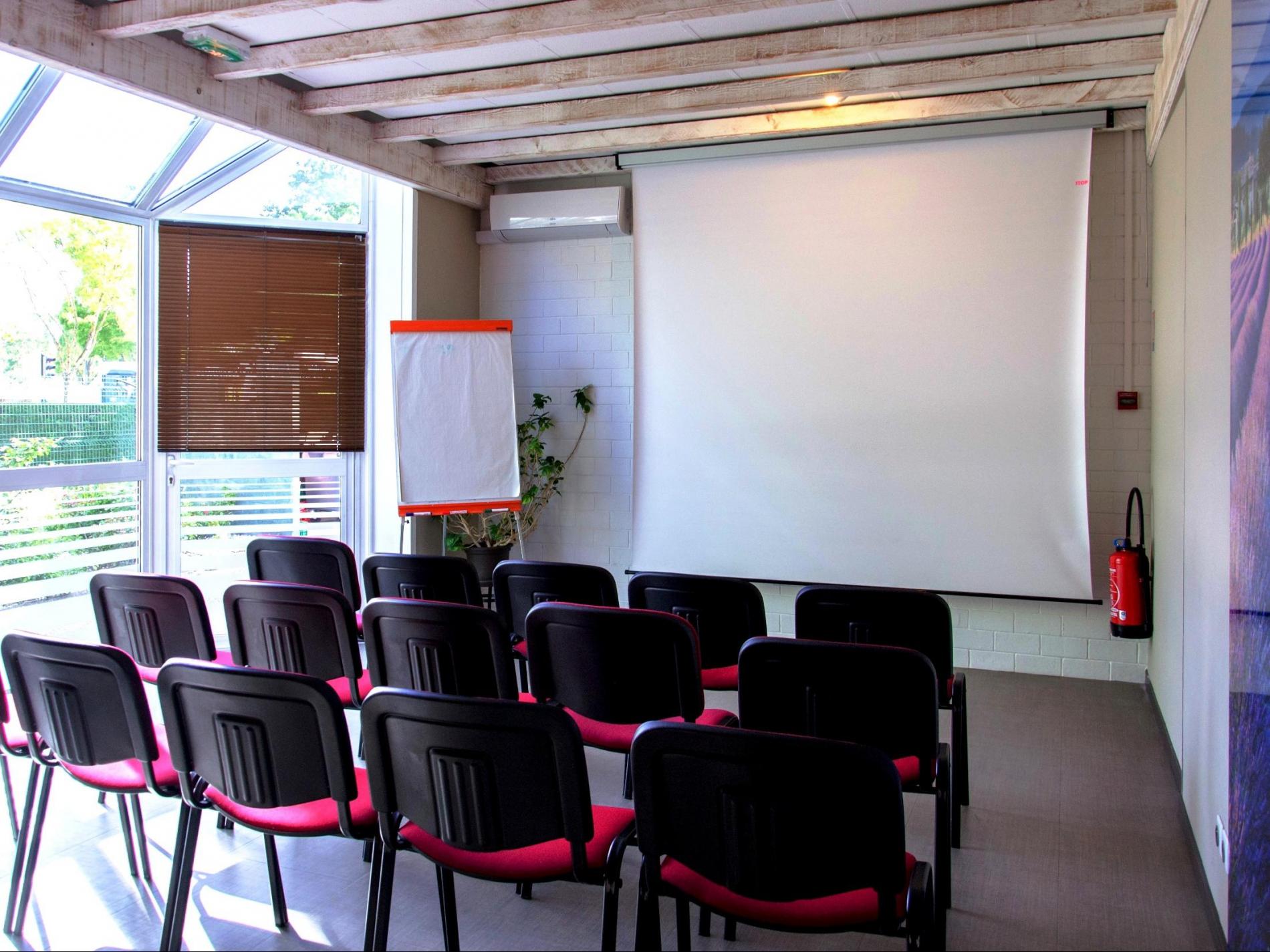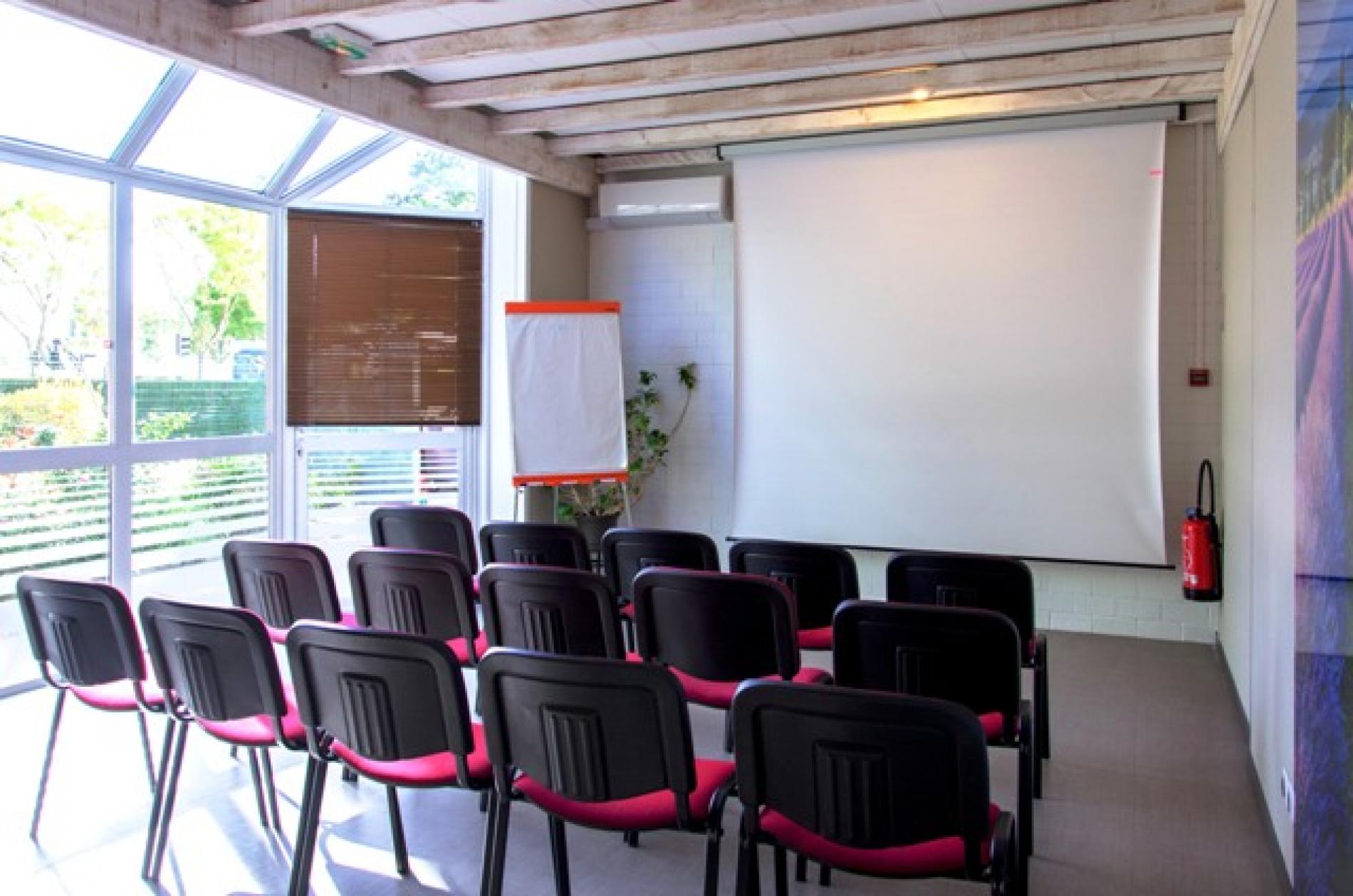 Baignée de lumière naturelle avec ses baies vitrées, climatisée et toute équipée (écran, vidéo-projecteur, paper-board, rétro-projecteur, connexion Wifi fibre), elle offre un cadre propice à d'efficaces séances de travail. Au choix, à la journée ou sur plusieurs jours, nous vous proposons des forfaits journée d'étude, séminaire semi-résidentiel ou résidentiel.
